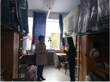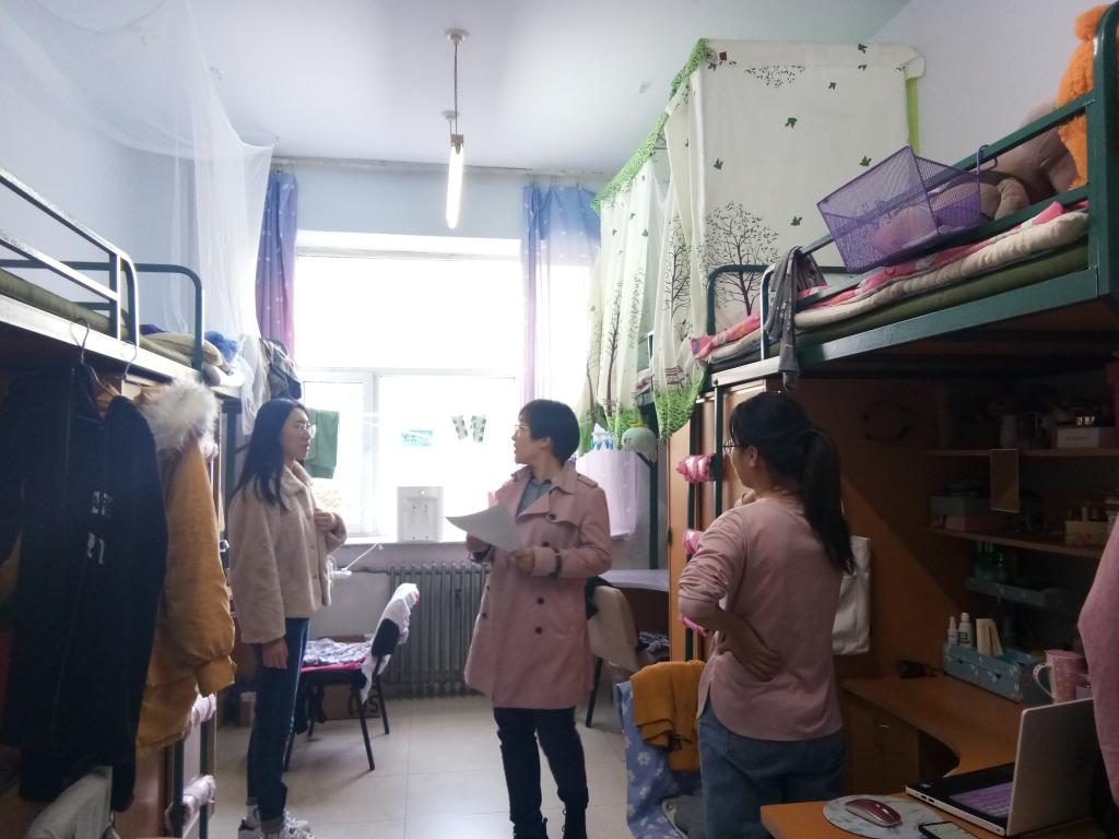 冯舒老师与在寝同学就近期学习生活情况进行亲切交流,对违章电器进行了排查,并询问了寝室用水、暖气更换、房间通风等情况。