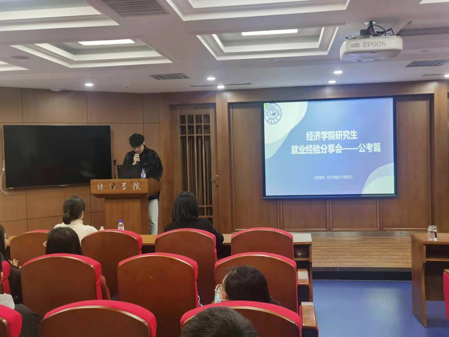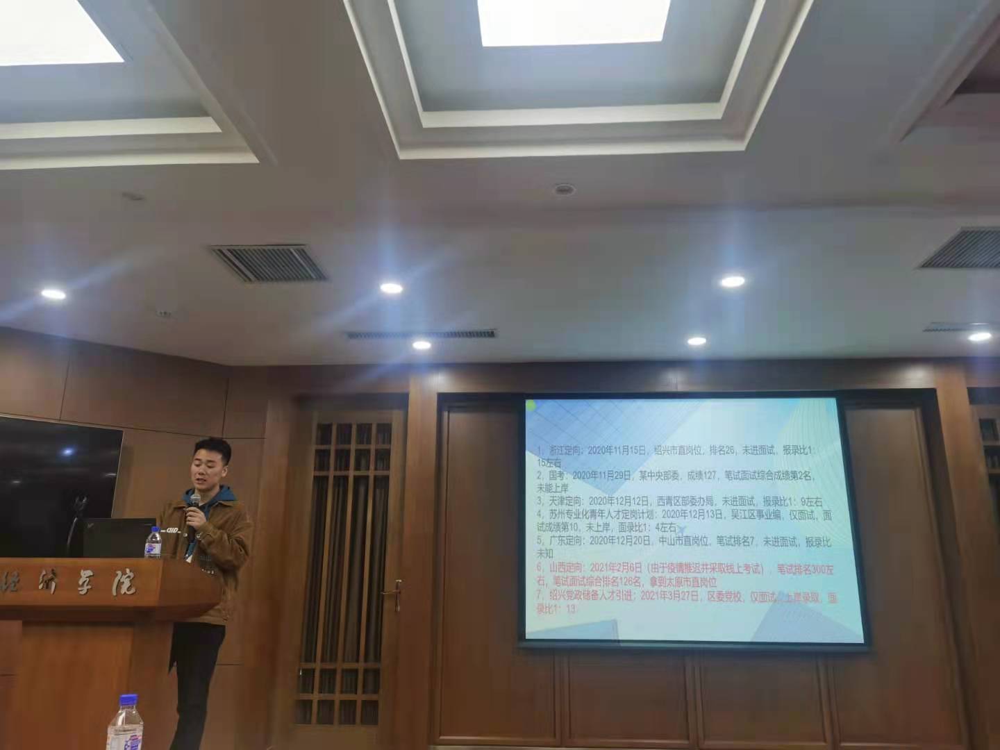 研会邀请六名已考取公务员的研二学生为大家介绍经验。几名同学从自身特点、专业知识、面试重点等方面热情洋溢地讲述各自考公过程中的重要经历和宝贵经验。其中,徐茂民从备考时间、备考科目、面试备考经验、四川省定向选调情况和岗位选择经验等五方面进行了介绍;秦涛从前期准备、笔试、面试、体检等四方面进行了介绍;李和从笔试备考经验、面试备考经验、以及个人备考省份等三方面进行了介绍;王静文从复习计划和经验建议等两方面进行了介绍;张佳琦从经验教训和黑龙江定向选调情况等两方面进行了介绍。