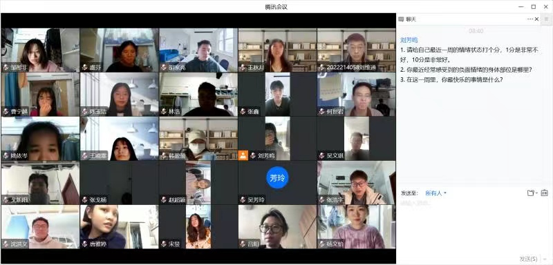 国经系、经济系和金融系开展主题为“心灵沟通”的线上主题班会。首先通过“摇摆时钟”的热身游戏,帮助大家训练自己的手脑协调能力。其次,“情绪安慰剂”环节了解到大家在疫情下的心理和情绪状态,并引导同学们可以通过寻找心理支持或内化的方式,做情绪的掌控者而不是被动接受者。最后,分组进行“不烦躁的理由”、“我的一天”、“见证彼此”等环节,讨论出我们面对负面情绪时的解决方法,在一天中如何安排自己的时间、平衡休息与工作以及互相欣赏,学习别人身上的长处,不断提升自己。