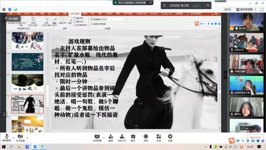 班会活动的第一部分为“摇摆时钟”的热身环节,主持人念出游戏口令,刚开始同学们都能够协调好自身,但随着难度升级后许多同学发现手指协调有着一定的阻碍。这告诉我们:在疫情当下,更应该调整好自己的心态,及时适应生活的改变。第二部分活动为“情绪安慰剂”,大家感受压力并得到感悟:我们都有感受到负面情绪的时刻,它们的存在自有其意义。我们可以向内发动自己潜在的力量,管理好自身情绪。活动进行到了第三项分组活动“不烦躁的理由”,组内自主讨论近期遇到的麻烦事然后转换角度思考不为此事烦恼的理由,这告诉我们应该在事情来临时及时转换好情绪,用笑容和理性击退烦躁!接下来就在分好的小组内开始第四项“我的一天”活动,小组成员积极提问,让同学们分享自己今天的状态以及放松的方法等,最后小组长总结到:我们在一天中的精力是有限的,而学会合理分配精力会使我们有更高的效率。在小组内成员了解大家的想法之后,我们进入了第五项温情环节“见证彼此”,同学们在其中收到了来自他人的赞美,看见了别人眼中美好的自己,同时也去发现别人身上的美。在活动的最后“我的收获”中,大家自愿发言,分享感悟。同学们在这次的班会活动中不仅仅学习到了缓解烦躁的方法知识而且还解决了自身的烦恼,发现了更好的自己。