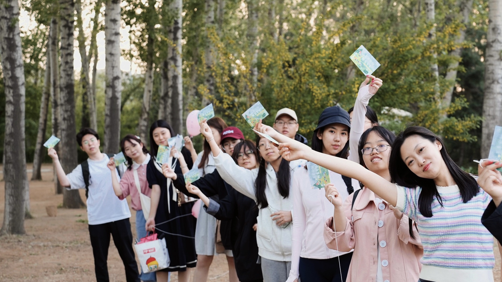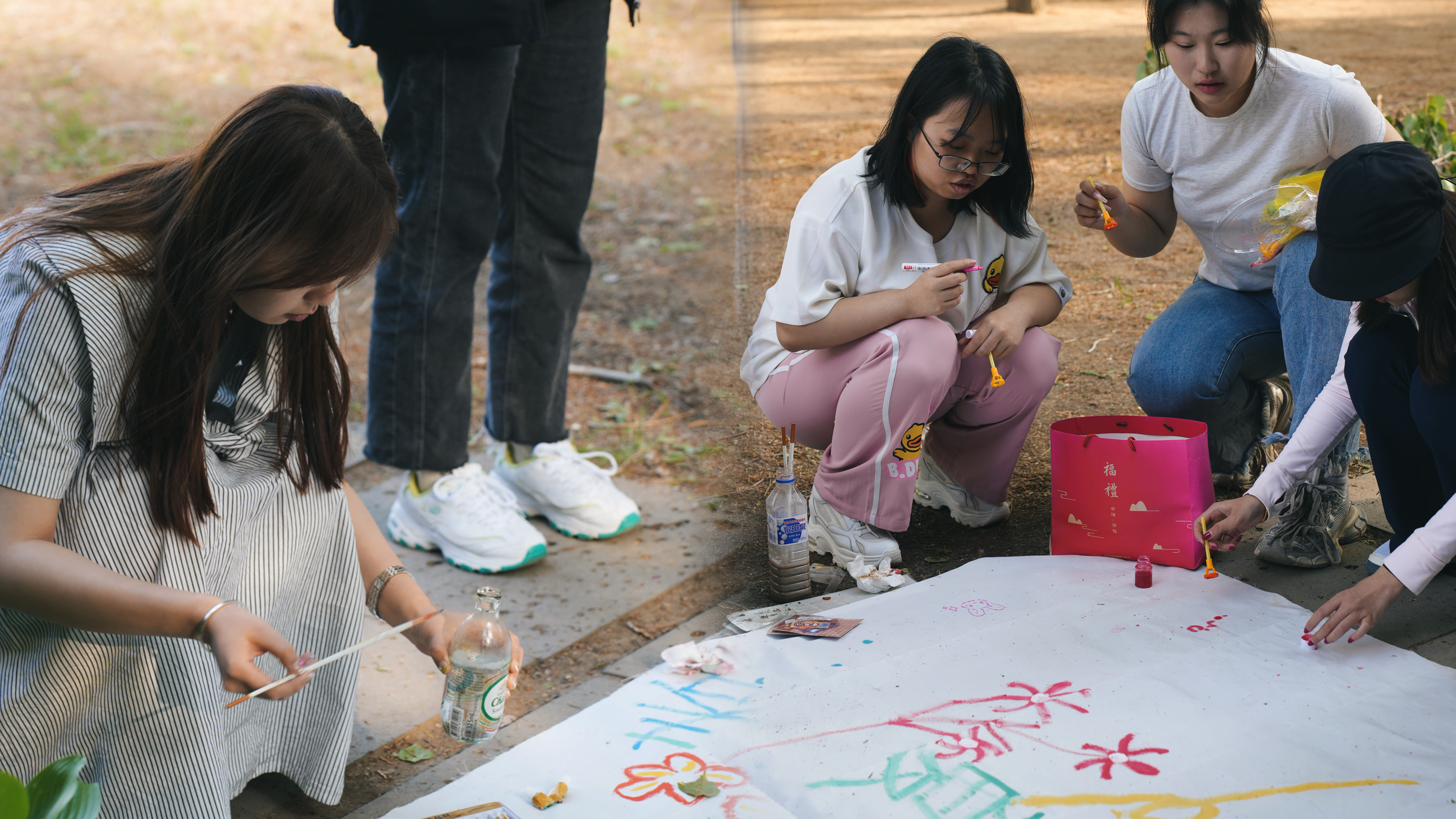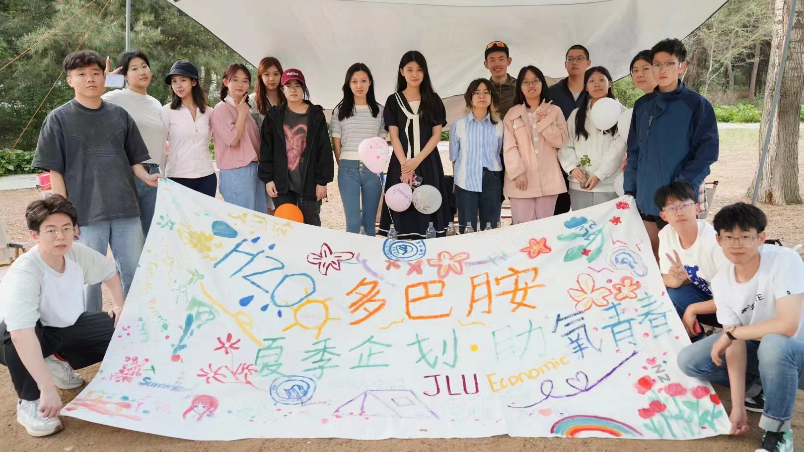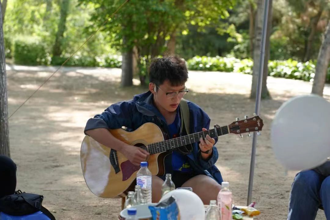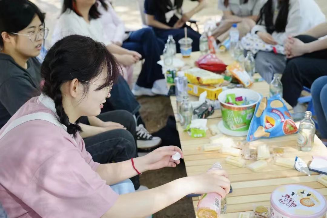在森林氧气的自然风光下,在吉他演奏的音乐氛围中,同学们相互熟悉,敞开心扉。同学们一同动手搭建起了“多巴胺营地”,用“春日收集瓶”制作了自己的独家春日记忆,还以绘画的形式将心事写在情绪气球中,进行了放飞烦恼活动。最后大家共同绘制了“多巴胺心愿图”,用水彩和拼贴将自己的心愿表达,又将七彩的泡泡吹在画卷之上,随性地进行装点。在动手绘制中捋清思绪,在泡泡的纷飞中感受青春的美好与自由。