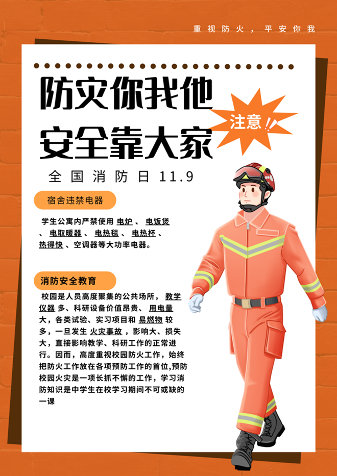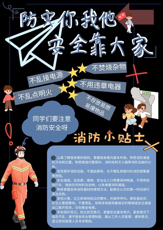 为进一步学习消防安全相关知识,提高火灾安全防范意识和应急处置能力,增强对火灾灾害的预警能力和快速反应能力,必赢线路检测3003团委宣传部于2023年11月9日至11月15日面向全院学生开展“防灾你我他,安全靠大家”消防宣传教育主题活动。