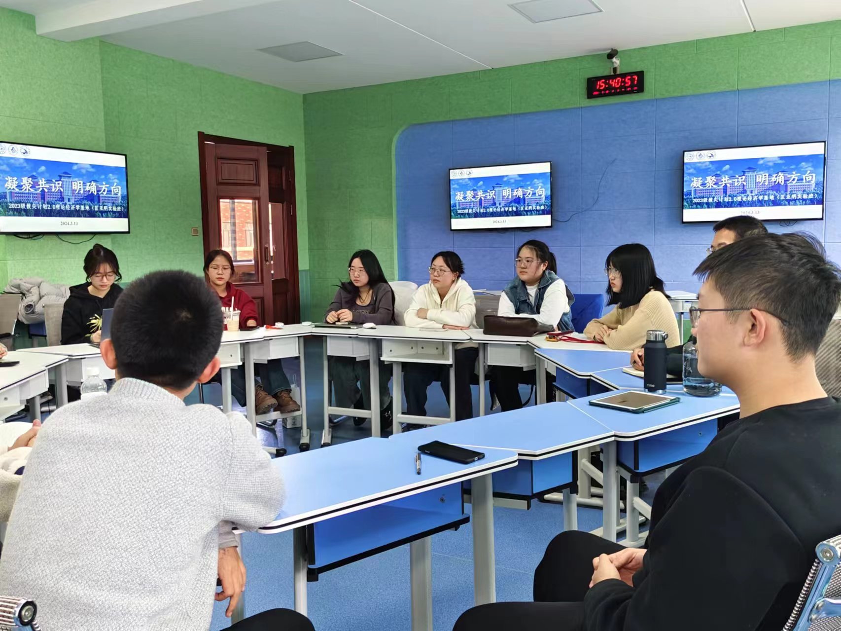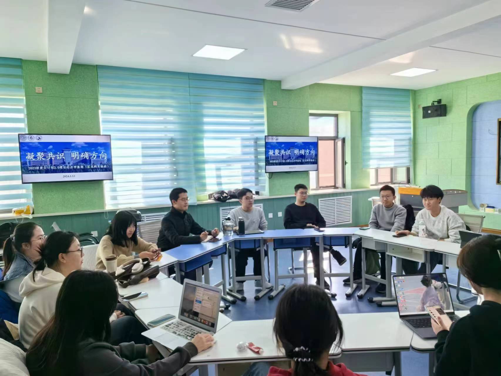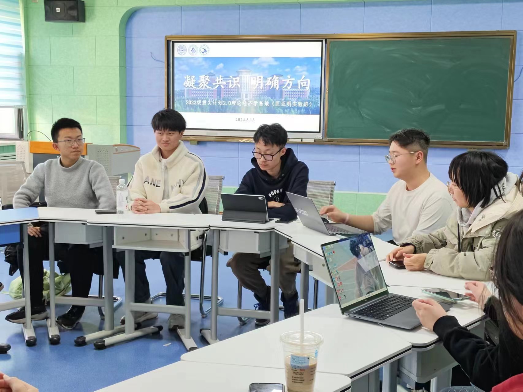 为增进同学间的友谊、凝聚班级力量,倡导同学们进一步融入班集体生活,参与班级建设,促进班级内部学习交流与共同营造良好生活学习环境,激发同学爱自己、爱班级、爱祖国的生活热情和学习干劲,增强向心力和凝聚力,2024年3月13日下午,2023级拔尖基地班(匡亚明班)在敬信教学楼举办一场主题为“凝聚共识,明确方向”的交流会。本次会议匡亚明班14名同学全体参与。