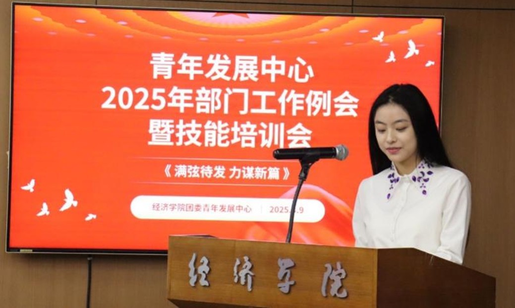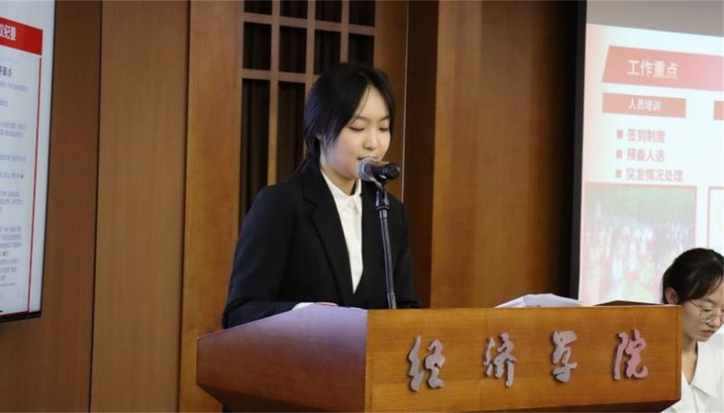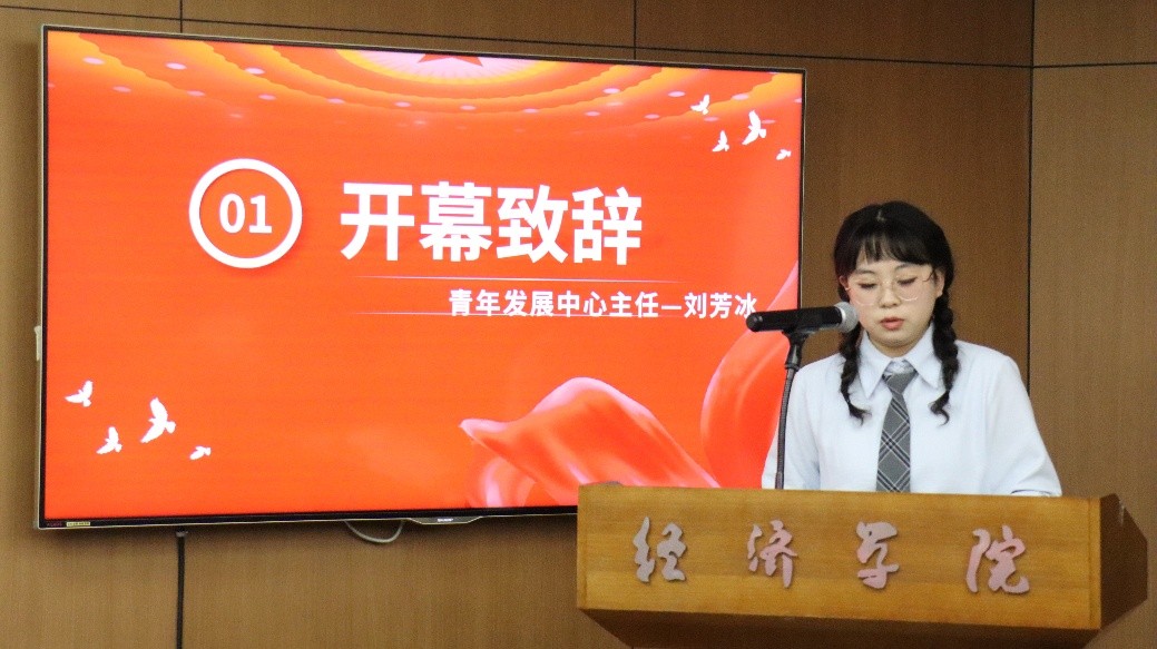 会议伊始,青年发展中心主任刘芳冰进行开幕致辞,宣布会议正式开始。在开幕致辞中,主任刘芳冰指明了本次会议流程,并且强调:“学院内,青年发展中心的文艺部和体育部如同推动校园文化经济蓬勃发展的两大强劲引擎”。
