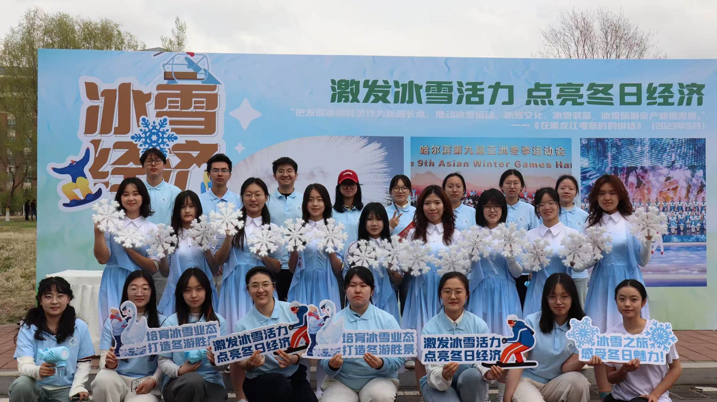 在活动现场,首先映入眼帘的是一群身着整齐浅蓝色服装的同学,他们手持精致的雪花道具,笑容灿烂地在“冰雪经济”主题展板前合影留念。展板上“激发冰雪活力 点亮冬日经济”的标语,以及“哈尔滨第九届亚洲冬季运动会”的字样,彰显着此次活动与冰雪盛会的紧密关联,也传递出对冰雪产业蓬勃发展的期待。