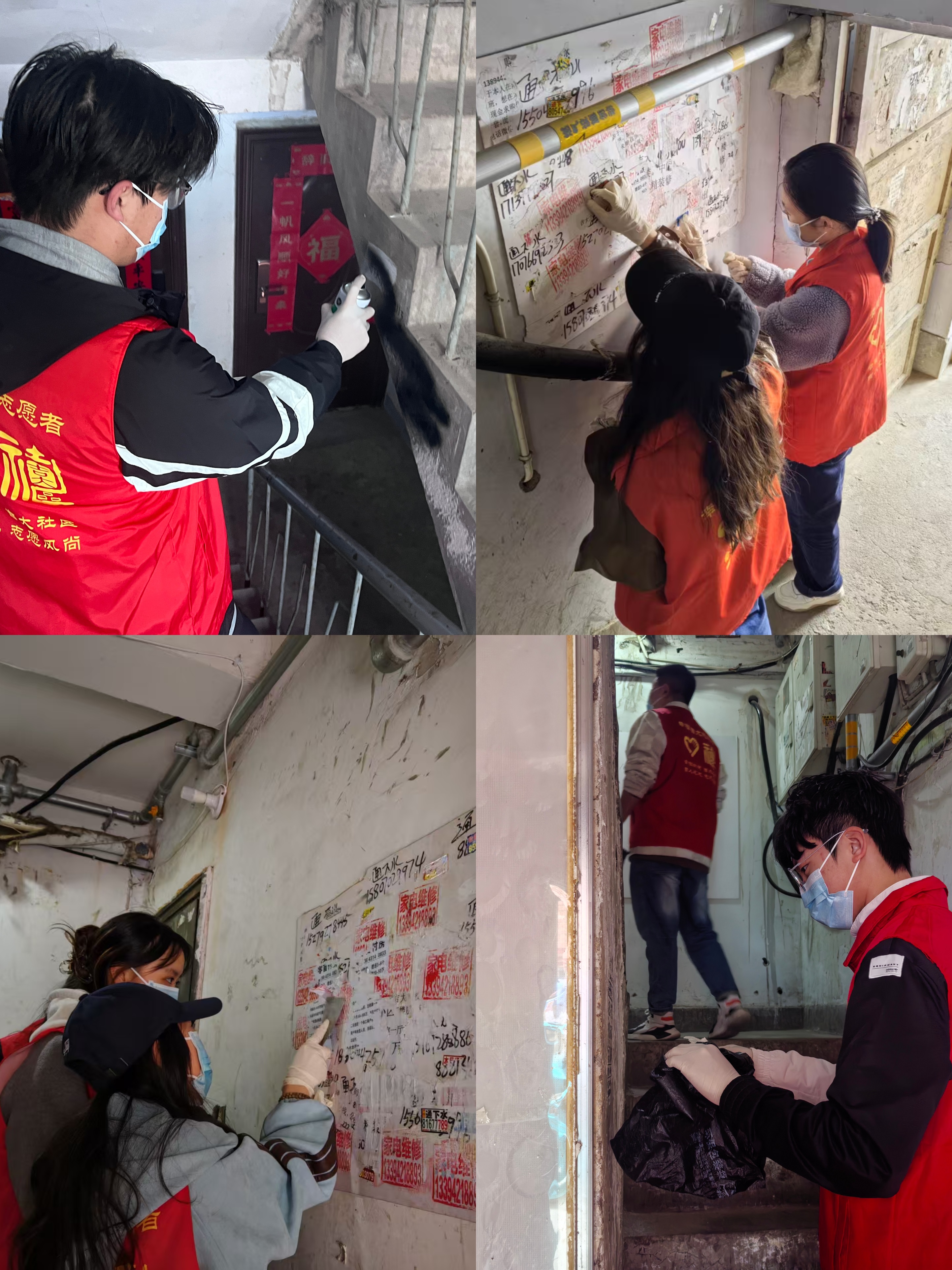 活动伊始,同学们在社区工作人员的引导下,迅速投入到各项志愿服务任务中。本次服务内容丰富多样,涵盖清理楼道小广告、清除违法乱纪宣传内容、整理社区公共区域杂物以及协助社区进行垃圾分类宣传等。同学们分工明确,各司其职,以饱满的热情和严谨的态度投入到志愿服务中。