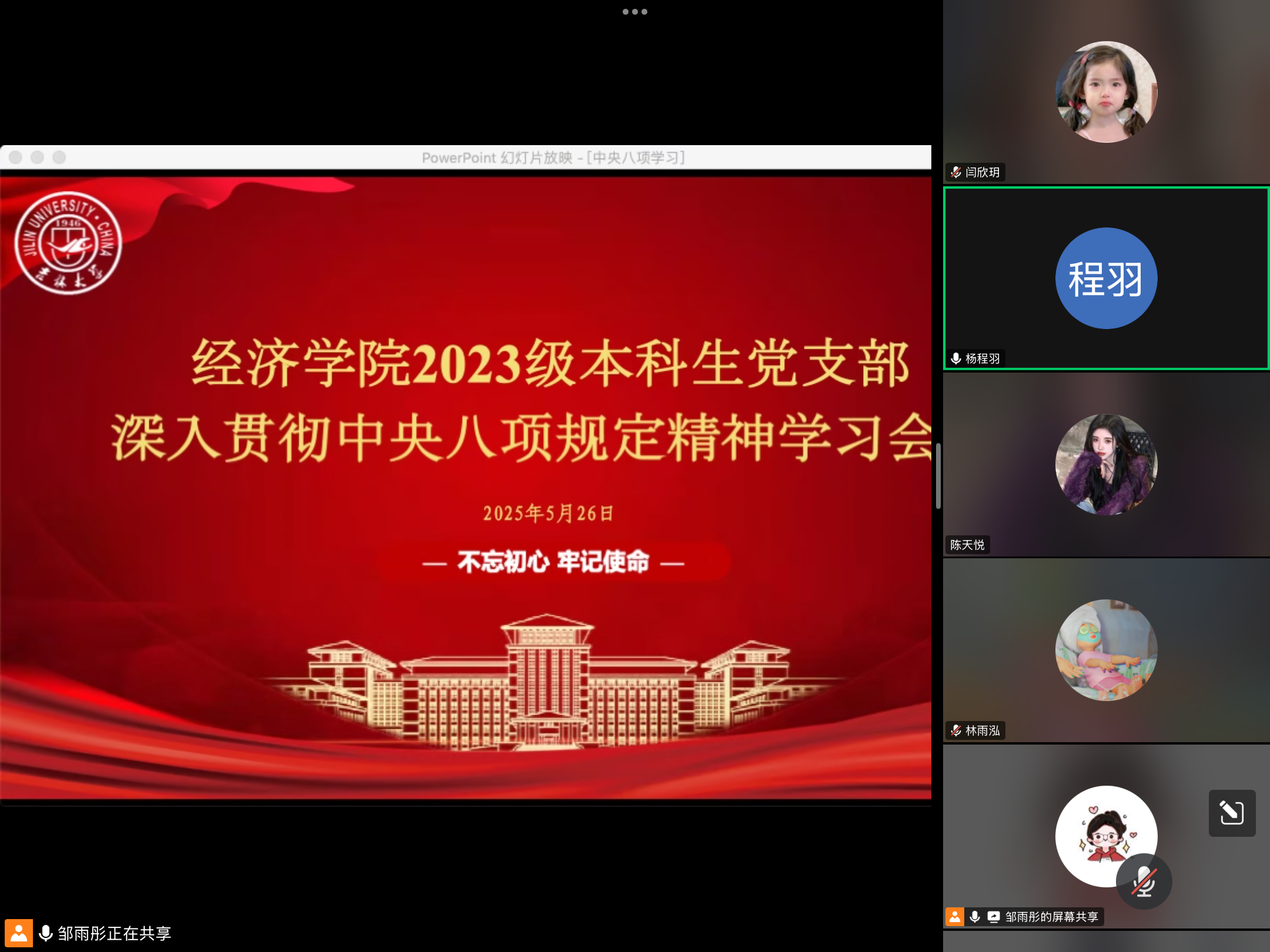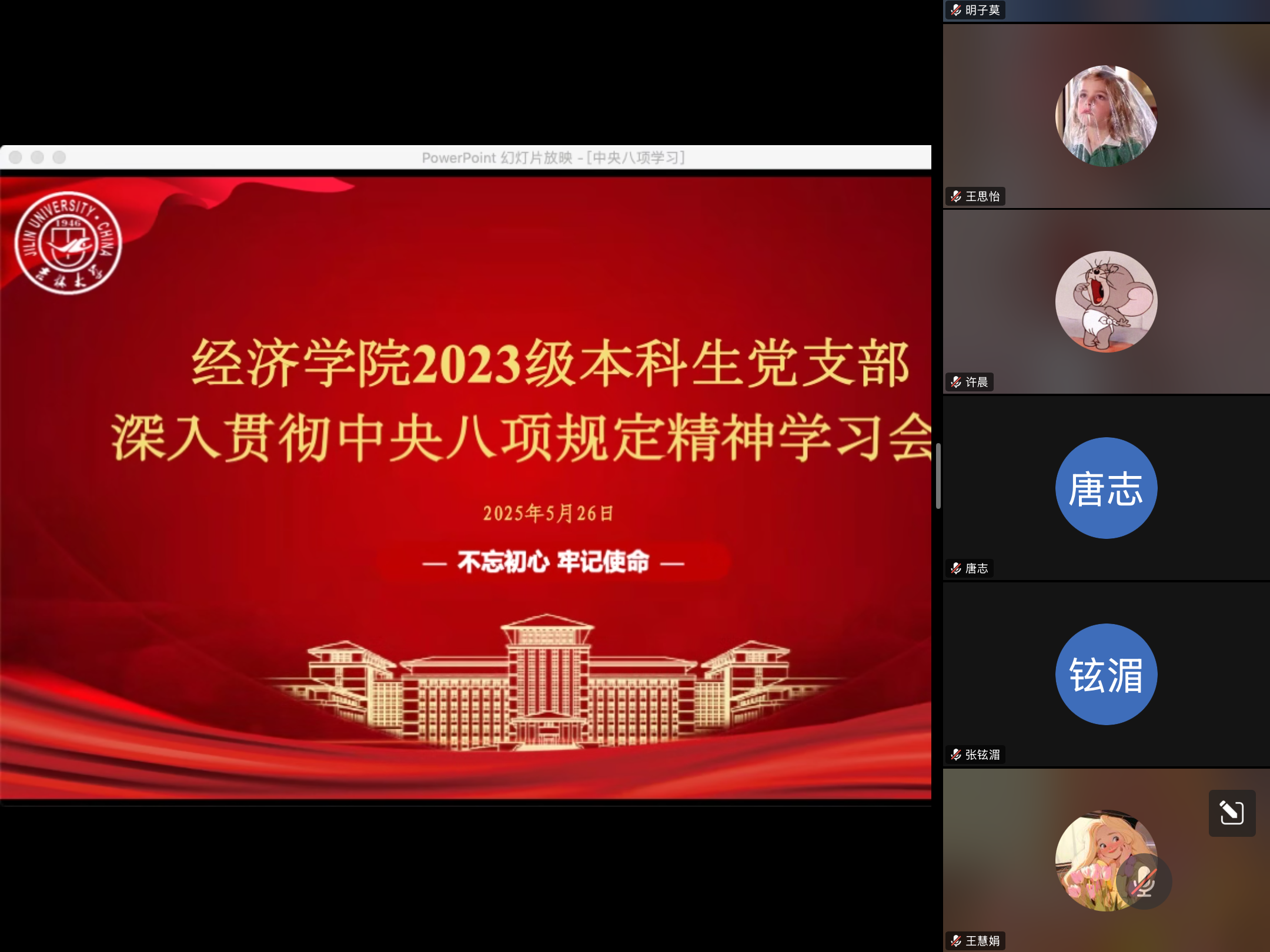 2025年5月26日上午,必赢线路检测3003no1必赢线路检测30032023级本科生党支部线上召开中央八项规定精神专题学习会。会议由党支部书记邹雨彤同志主持,2022级本科生党支部书记王慧娟同志、2024级本科生党支部书记唐志同志列席了会议,党支部成员积极参与学习讨论,并结合实际提出意见,为推动作风建设与校园廉洁文化深度融合建言献策。