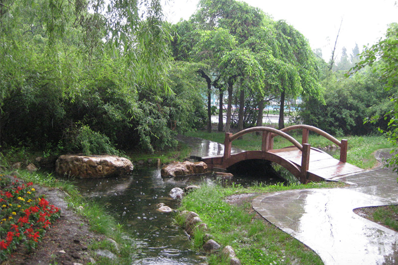 老郭潺潺流水,雨打木桥 体育馆东侧花园