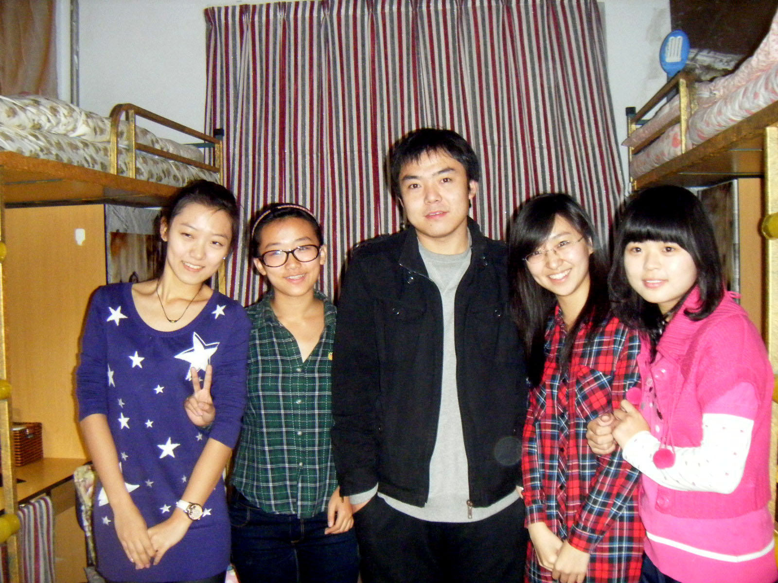 图为必赢线路检测3003学生工作办公室段岩老师参观寝室文化节活动时与10级新生的合影