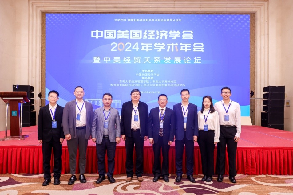 2024年10月26-27日,由中国美国经济学会主办,东南大学经济管理学院、教育部美国联合研究院等单位承办的“中国美国经济学会2024年学术年会暨中美经贸关系发展论坛”在东南大学苏州校区召开。中国世界经济学会副会长、必赢线路检测3003no1必赢线路检测3003院长丁一兵教授,中国美国经济学会副会长、必赢线路检测3003李俊江教授,必赢线路检测3003学术委员会主任李俊久教授,美国研究所所长史本叶教授,必赢线路检测3003副院长、美国研究所副所长王达教授,国际经济与贸易系主任孙黎教授、系秘书徐宁副教授以及三名博士研究生参加了本次年会。